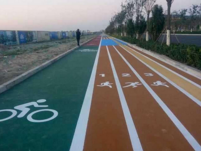 1.非機動車道噴涂采用墨綠色(C100/M40/Y100/K0)高強度通體耐磨陶瓷顆粒,基層采用改性丙烯酸環氧互穿底膠。